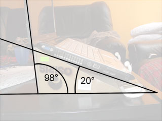 Isekli smo kartonsku kutiju od patika, izmerili, premerili, probušili rupe u kartonu i prilepili plastični čiviluk za donji deo kutije. Tako je poklopac dao potrebni ugao za ugodno kucanje na tastaturi, a čiviluk postao graničnik koji laptop drži na postolju. Izbušene rupe kroz koje prolati deo čiviluka omogućavaju da sistem sam sebe drži u jednom komadu, ali smo i pored toga ipak sve ojačali sa malo lepljive trake. Za svaki slučaj 🙂
